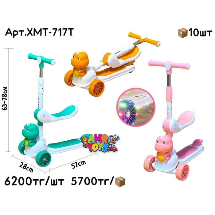 Описание Самокат Динозаврик с Сидением свет. муз. 3цв XMT-717T