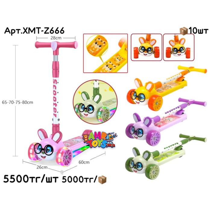 Самокат Зайчик с очками свет. муз. 4цв. XMT-Z666